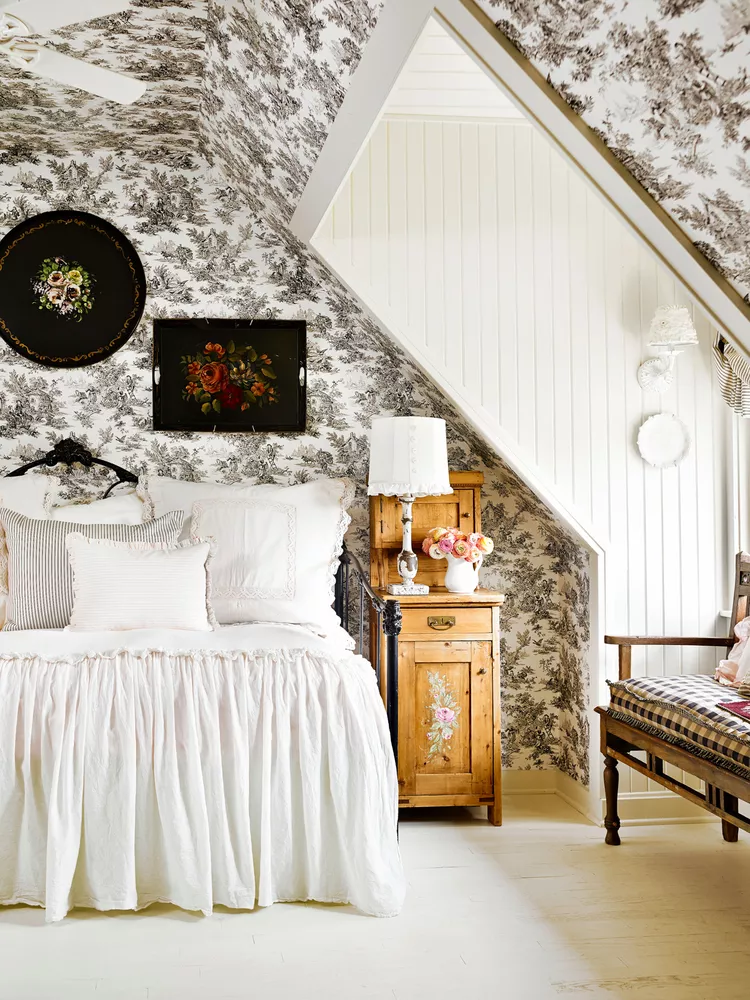Giấy dán tường không chỉ dừng lại ở các mảng tường mà còn lan rộng lên cả trần nhà. Từ hoa văn Chinoiserie tinh tế đến vải cỏ mộc mạc, việc sử dụng hoa văn đồng bộ giúp truyền tải cá tính mạnh mẽ và tạo nên một không gian nghỉ ngơi đậm chất nghệ thuật.